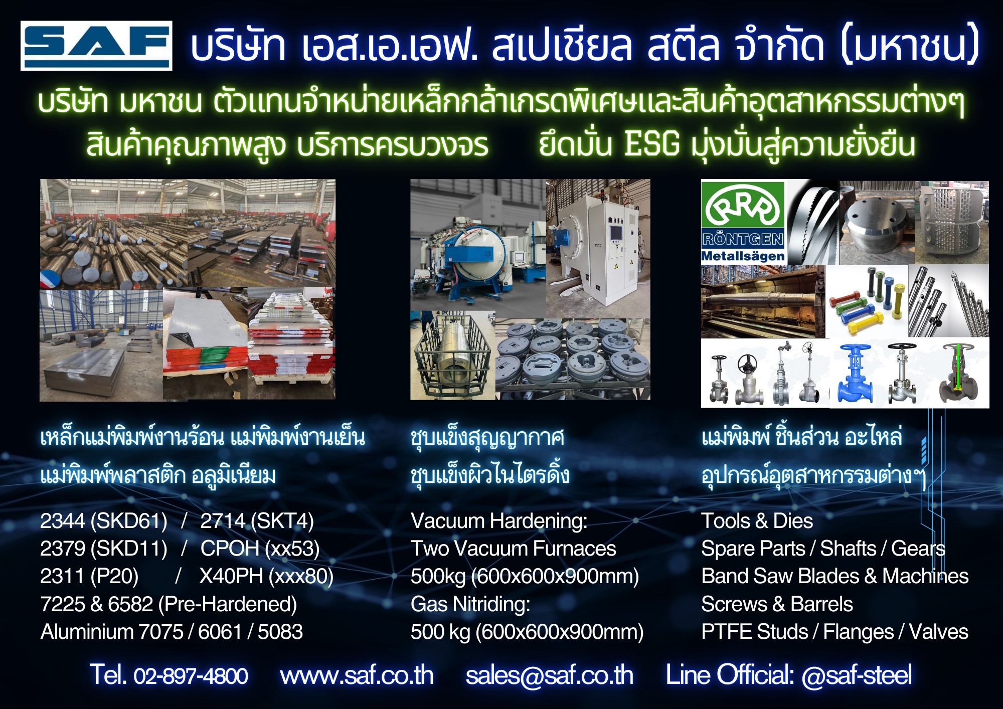 S.A.F. SPECIAL STEEL PUBLIC COMPANY LIMITED was found on November 30, 1992 by Ms. Sumon Sae-Iad who has great expertise and experience in special steels. By the way, S.A.F. has been the officially authorized distributor of special steels from the top-class companies: DÖRRENBERG EDELSTAHL GmbH, WILHELM OBERSTE-BEULMANN GmbH, and UNIVERSAL GmbH. Additionally, S.A.F. is the exclusive agent in Thailand for selling the worldwide leading band saw blades branded RÖNTGEN from Germany, and the famously reliable band sawing machines named CHENLONG from China.